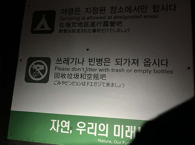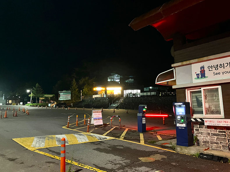 智異山内はルートの各ポイントでゲートが設けられており、登山者の安全や植生保護のため通過できる時間が制限されている。ここ登山口のゲート解放時間は午前3時。まだ時間がある。近くの24時間開いている休憩所のベンチで横になって少し仮眠をとらせてもらうことに。