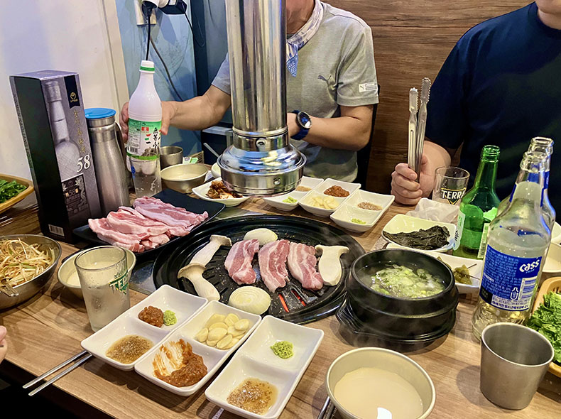 昨夜山でいただいたサムギョプサルももちろんおいしかったが、お店で食べるのはやはり格別。いろいろな種類のキムチやタレが所狭しとテーブルに並ぶ。チャミスルやマッコリなどといったお酒を片手に、炭火で焼いた豚肉のおいしい煙に包まれながら、みんなでワイワイといただく。豚バラ肉の脂はサンチュに包めば0カロリーになるという暴力的持論のもと、夢中で食べる。うん、韓国大好き!!