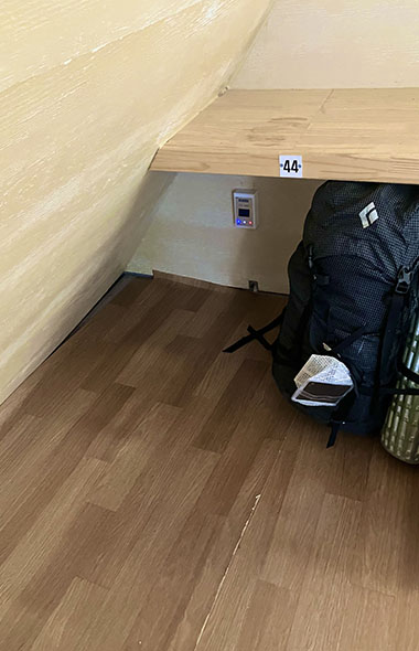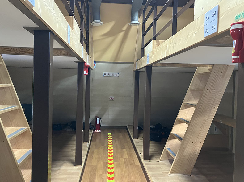 管理人の方がカタコトの英語で一生懸命設備について説明してくれた。多少の非常食は売っているが、基本は自炊の素泊まり。小屋の中は一人ずつ横になれるくらいのスペースが区画ごとに分けられており布団などはないシンプルなつくり。宿泊費は一泊たったの12,000₩ (日本円で1,200円ほど)!しかも驚いたのがひとりひとりの寝床にオンドル(韓国の伝統的な床暖房)があるというのだ!