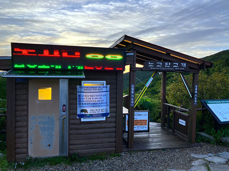 歩き始めて1時間ほど、智異山三大峰のひとつである最初のピーク 老姑壇(ノゴダン)へ向かうゲートに到着。ゲートの開放が5時からとのことで、しばし待機。