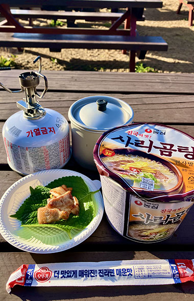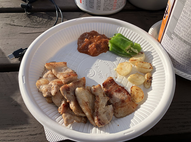 うまそうに肉を頬張るハイカーたちを横目に、ひとり湯を沸かして寂しくカップ麺をすする私。すると、日本人の私が珍しかったのか、あるいは私があまりにも卑しい顔をしていたからか、次から次へと周りの人たちが「これも食え」とサムギョプサルを持ってきてくれた…!