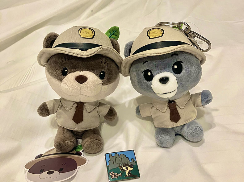 かわいいマスコットをいただいた。韓国の国立公園にはそれぞれマスコットキャラクターがいるらしく、右のクマは今回登った智異山、左のカワウソは無等山のキャラクターとのこと。こんなん…集めたくなるやんか…