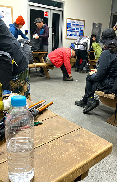 ベンチで30分くらいウトウトしただろうか。どうやらソウルから夜行バスが出ているらしく、ゲートの解放時間をめがけて一気にハイカーたちが押し寄せてきた。とても寝ていられない。寝不足だが仕方なく準備をすることに。