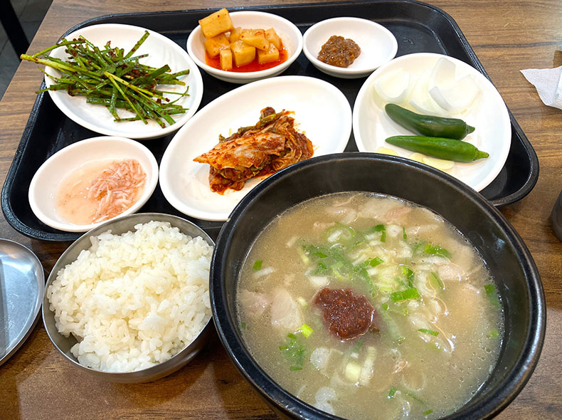 この日は釜山駅近くにある相部屋の安宿に泊まることに。空港から釜山駅までの道に迷いまくり宿につく頃には21時を回ってしまった。目的のサムギョプサルはいったん見送り、地球の歩き方に書いてあった「テジクッパ」という釜山名物の豚骨スープの店に夕食を求め入ってみることに。