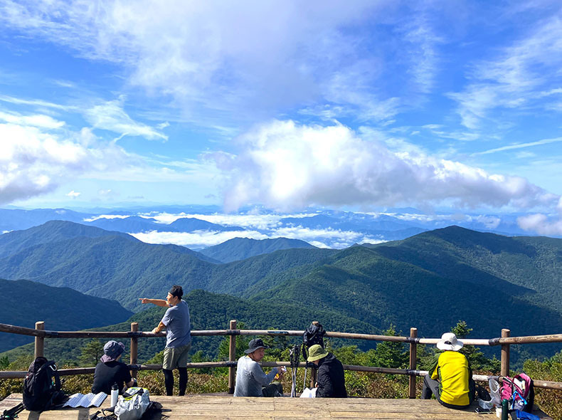 2時間ほど歩き、智異山三大主峰の2つ目である般若峰(パニャボン)への登りが始まる。山頂直下にザックをデポし、急登を黙々と進むと景色が開け、気持ちの良いピークが現れた。