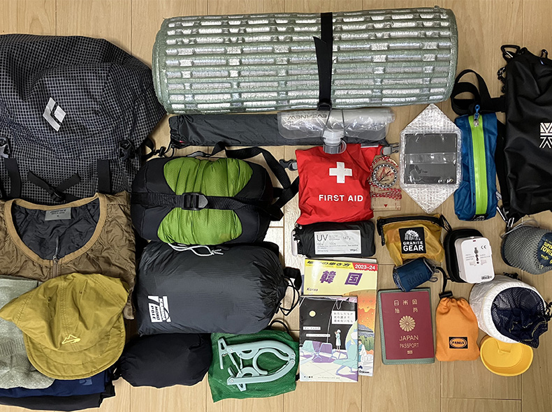 今回のパッキングアイテム。スマホでなんでも調べられる時代だが地球の歩き方だけは常に持っていくと決めている。
