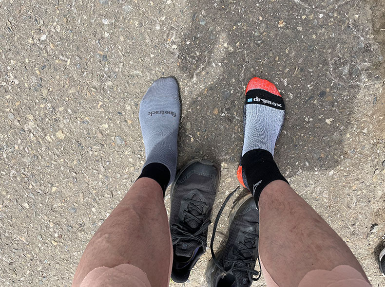 今回試したのは、ドライレイヤー®クールタンクトップ+ラミースピン®エアTシャツ、ソックスはラミースピン®ソックスにドライレイヤー®5本指ソックスのレイヤリング。腕はドライレイヤー®ウォームのアームカバー。汗をかいても肌はさらさらで、濡れてもすぐ乾く。ドライレイヤー®ウォームアームカバーは体温調整がしやすい。テーピングも効いている。