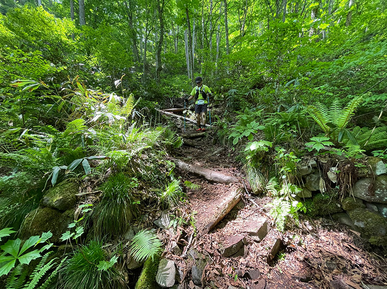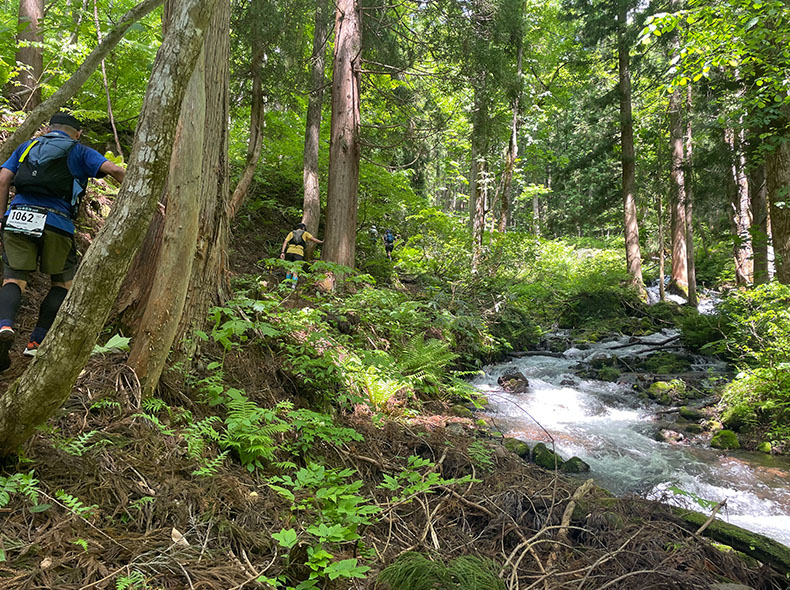 第1エイドまでの5kmは、ほんの序章だ。エイドを過ぎ、本沢川沿いに続く登りセクションに差し掛かる。