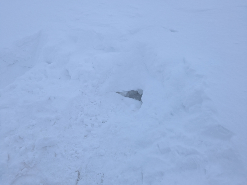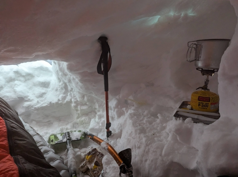 新雪の下は雪が硬化していたが、場所を変えたりイグルーを作る手間を嫌い、半身が収まる程度の穴に身をかがめて、やり繰りした。エアマットの上に体育座りし、身体は、ダウンが濡れないようシュラフカバーの口を縛った物を掛布団のように被せて保温した。