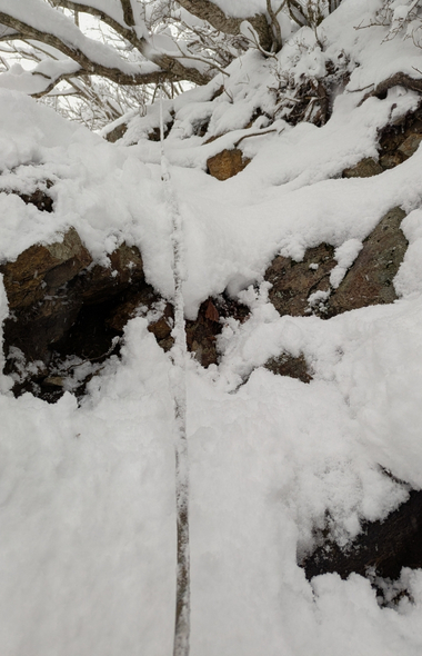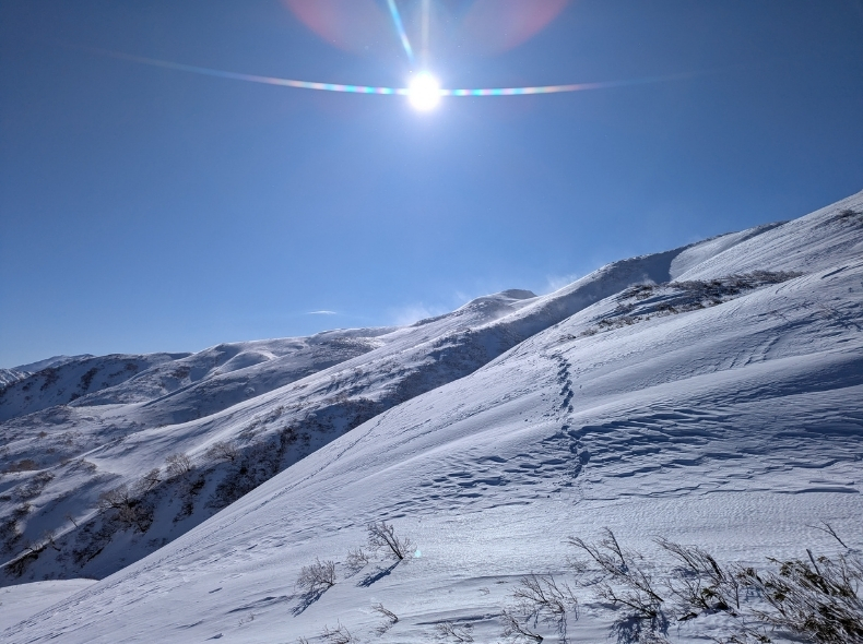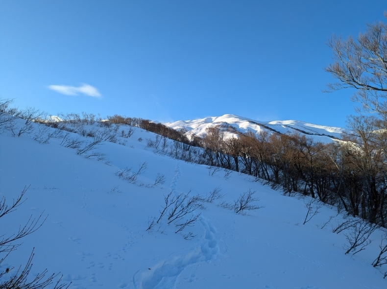 一番の難所だったのは、地神山から北東の尾根に下りる箇所。草木が途切れ、雪庇のように見える箇所を適切に判断して下りなければならない。絶対ここだ、と分かっていても雪庇を踏み抜く恐怖は消えない。