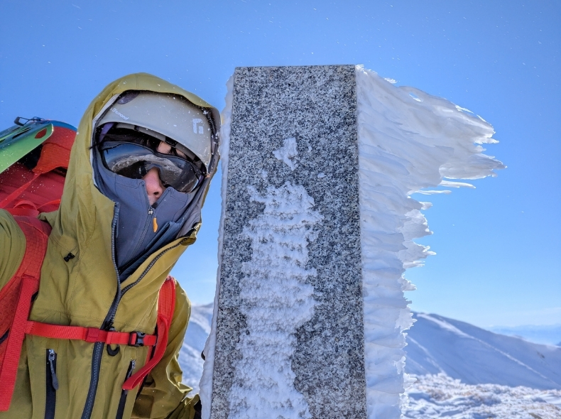 そこからはサクサクと進み、山頂直下でアイゼンとハードシェルを着用。無事、飯豊主稜線上の山、頼母木山(たもぎやま)に到着。