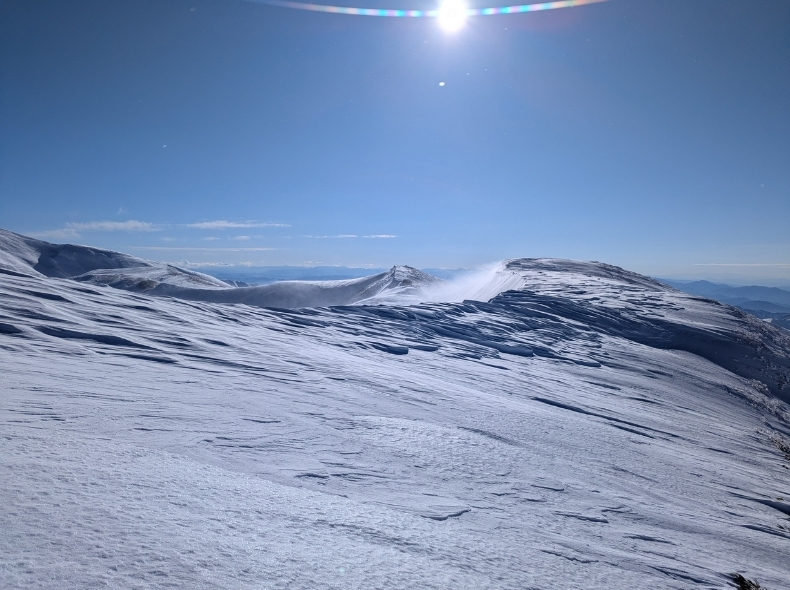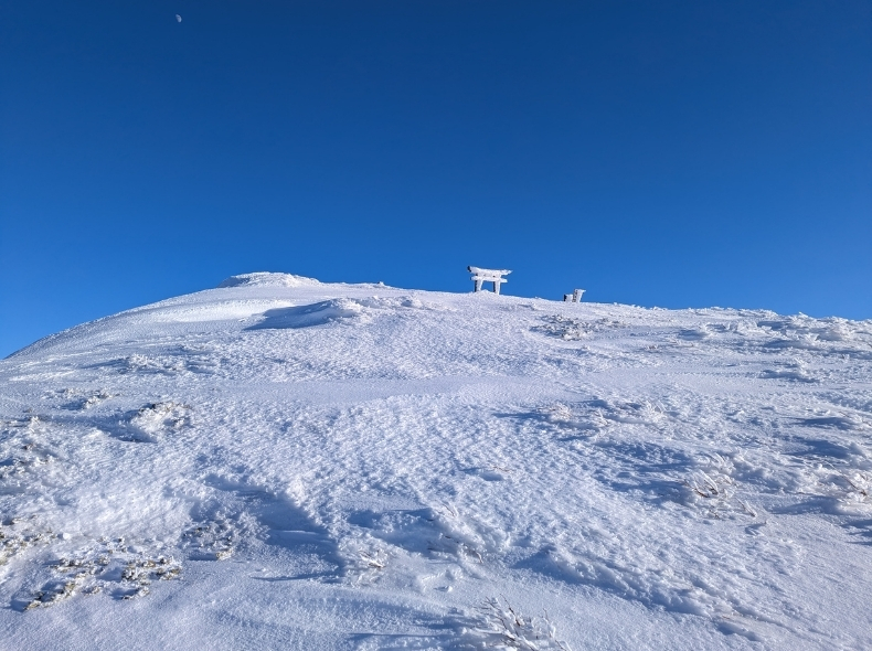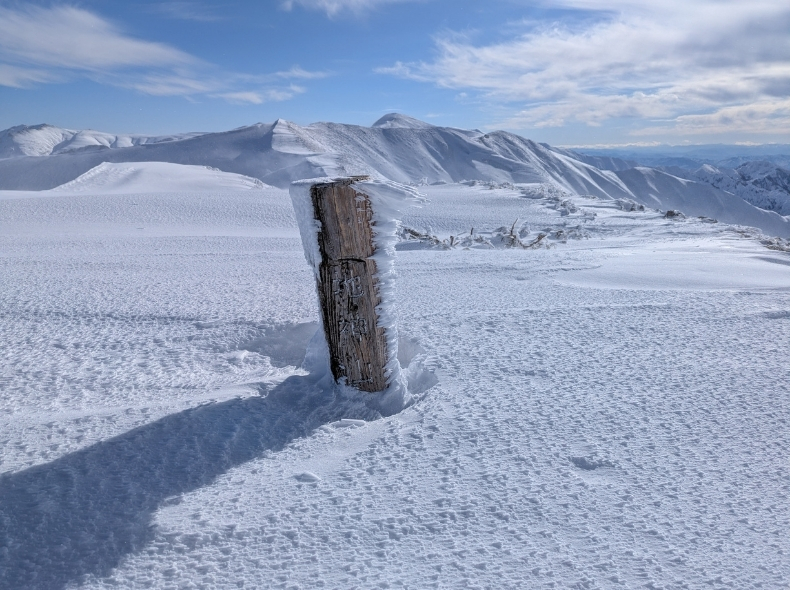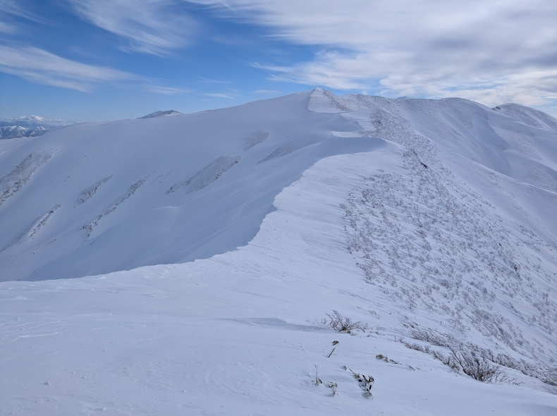 1500m辺りからは、風に吹かれて雪面が固まっており歩きやすい。夏山の0.8倍速くらいでは歩けていた気がする。