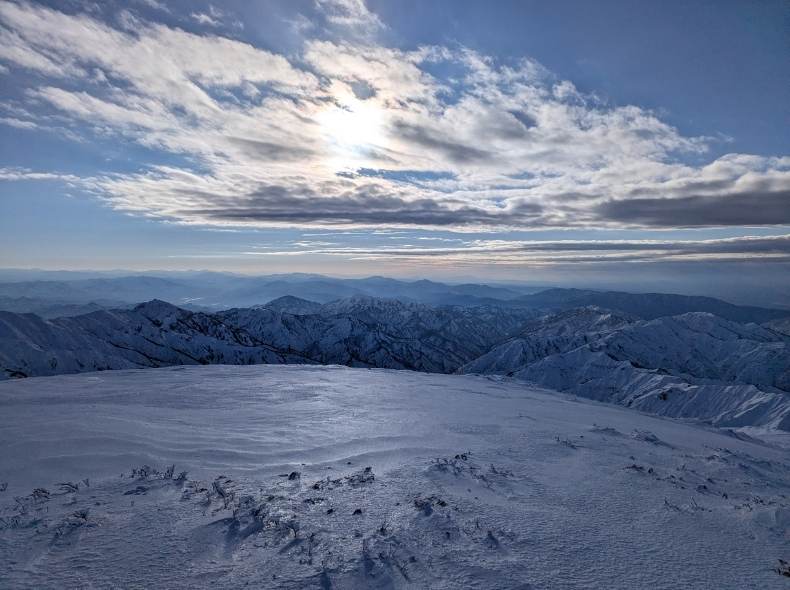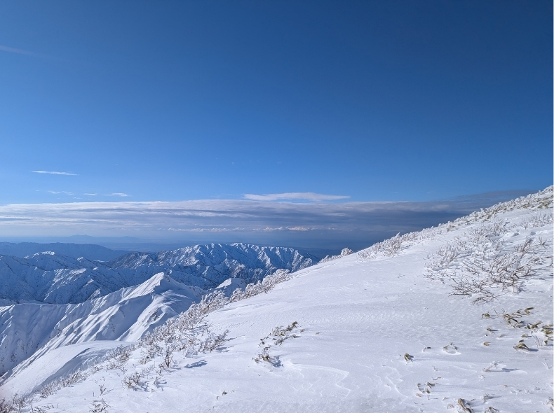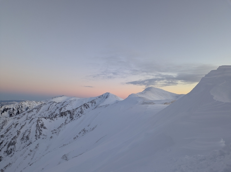 日本海側からは、黒みがかった雲がだんだんと近づいてきていた。この稜線では悪天候やトラブルにあっても雪洞を掘るほどの雪はない(切れ落ちた雪庇を乗っ越せば別だが)。テントを張っても強風には耐えられないだろう。