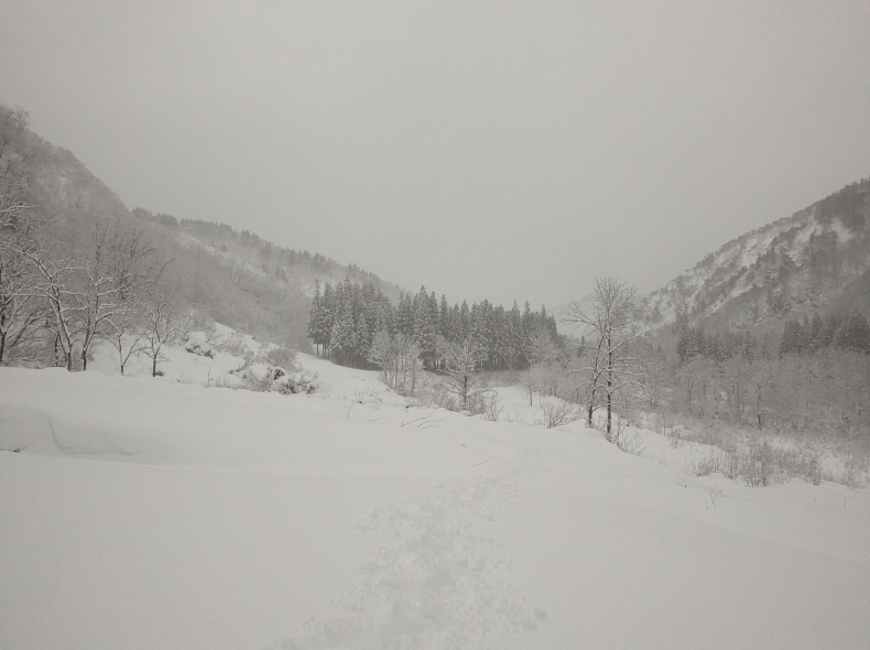 前日からかなりの降雪があり、スタートから終始膝〜太腿ラッセル。他には人が入っておらず、先頭でのラッセル。ラッキーだ。