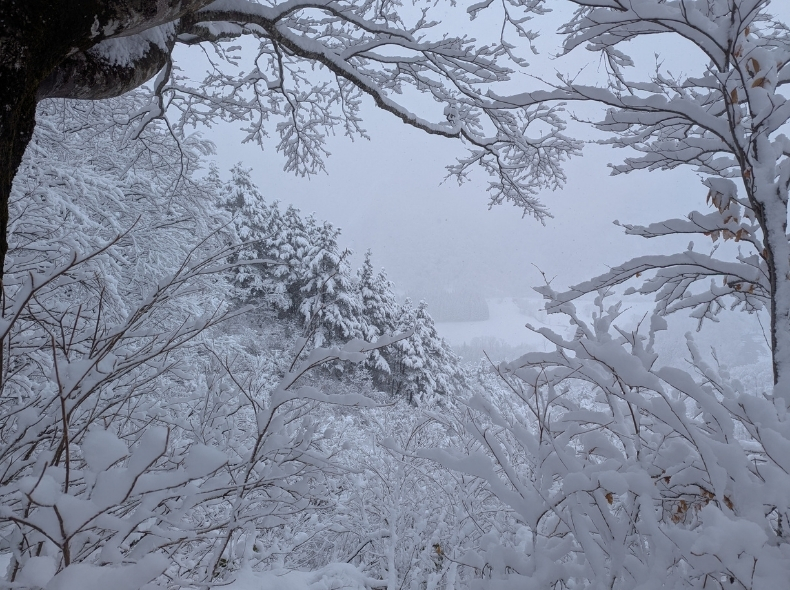 諦めて寝ていると、11時頃に段々雪が落ち着いてきた。気持ち視界も良くなっている。