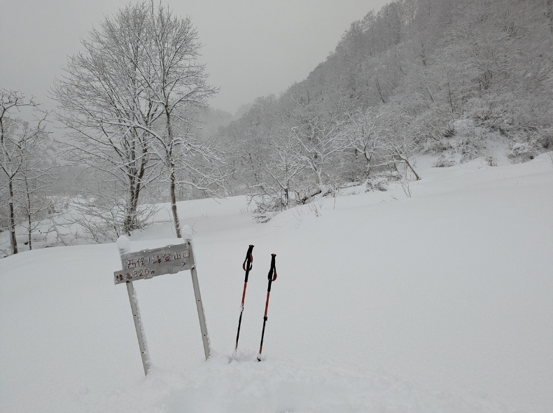 除雪車の雪捨て場から入山し、西俣ノ峰登山口まで歩く。
