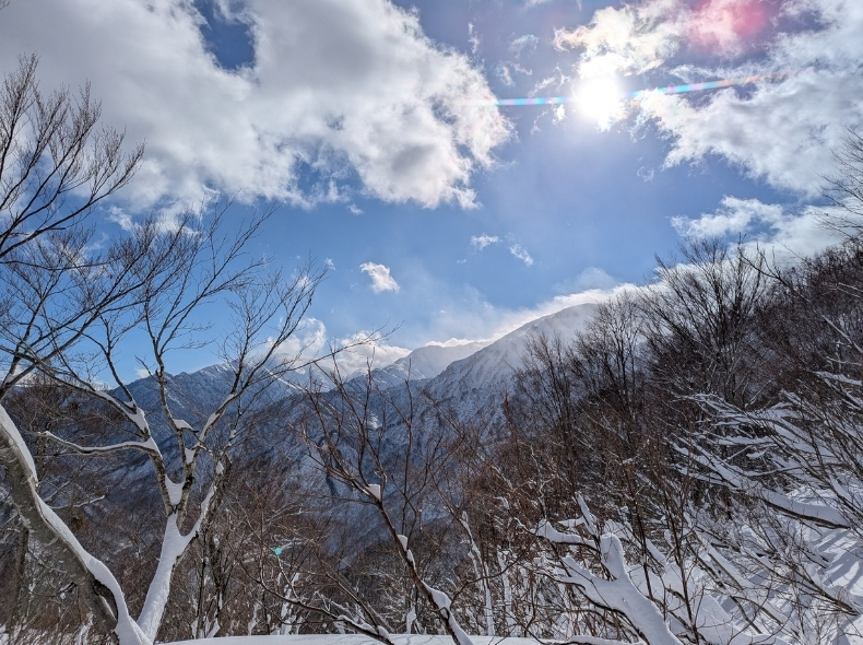 ここから迷うことは無いが、ひたすら標高を上げていく作業が続く。自分の力だけで山に登れるのは嬉しいことだと思いつつも、やはりラッセルは辛い。9時頃からは降雪が止み、晴れ間が見えてきた。