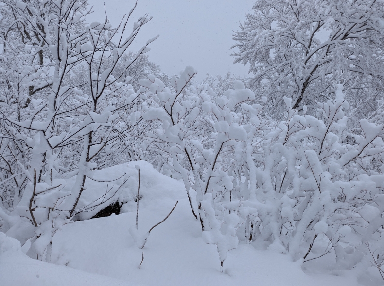 雪庇も予想よりは発達しておらず、ホワイトアウトしても足元の木と石を辿れば、雪庇を踏み抜くことなく安全に帰れるだろう。そんな事を考えつつ、地形を観察しながら進む。