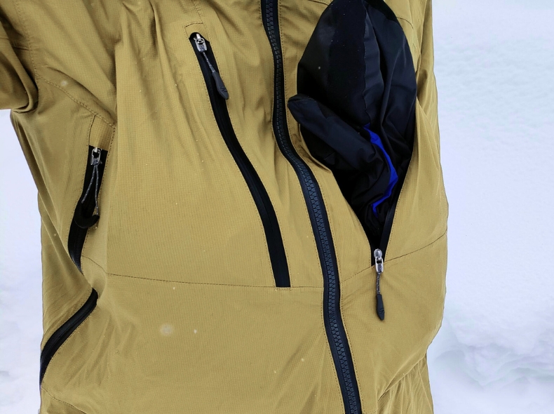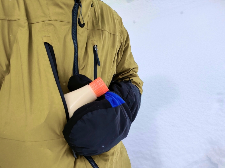 また、胸ポケットの容量が大きく、保温ボトルやオーバーグローブなどがスッキリ収納できる点も使い勝手が良い。