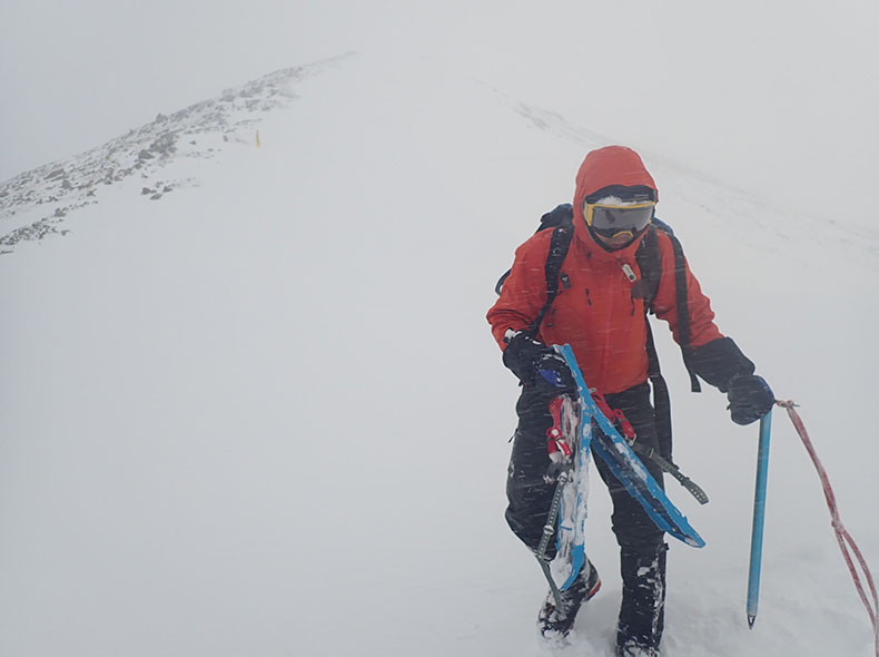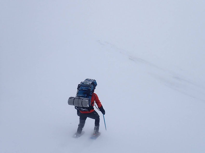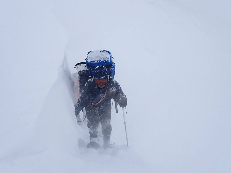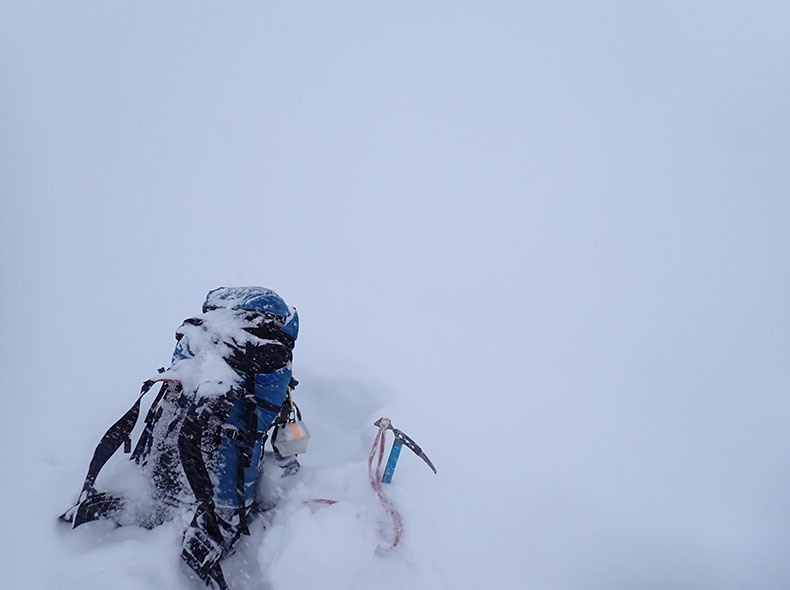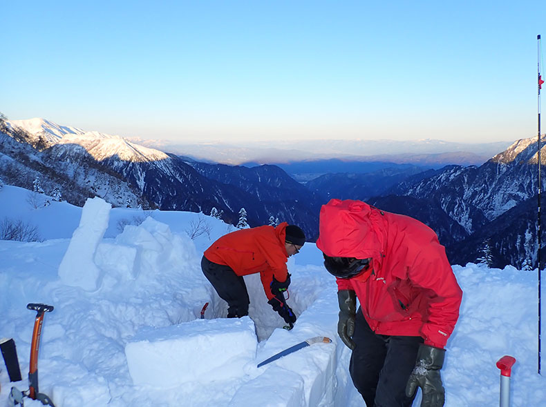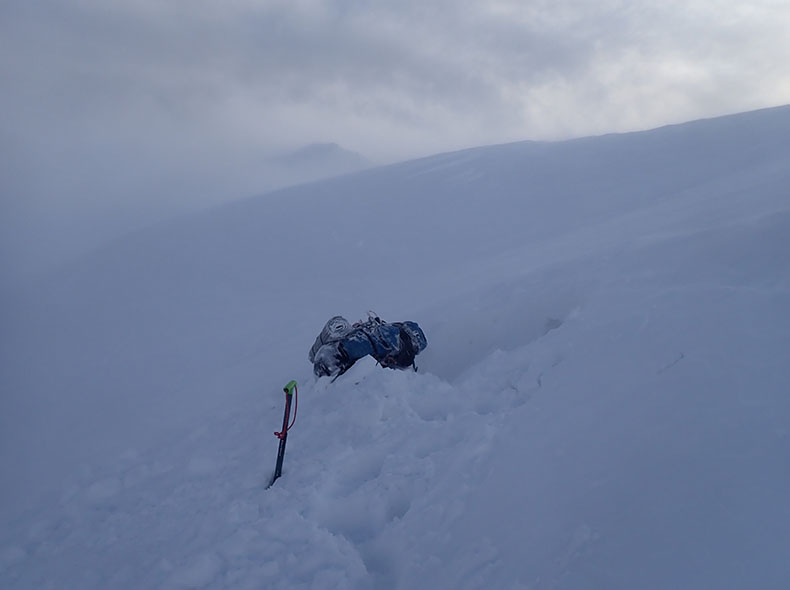 森林限界を超えてからの稜線は、環境が特に厳しかった。天気が良いとされる日でも、風は強く視界は悪く、天気が悪い日は話にならない。今回必要だったのは、視界のない爆風下でも雪洞適地を見つけ、落ち着いて作れる精神と技術と体力だった。