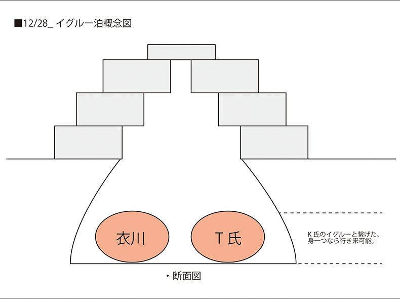 イグルー概念図。時短のために、足元からブロックは切り出し、半雪洞のようにして広げている。イグルスキー米山さんのイグルーを参考にしている。