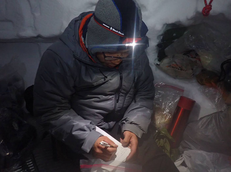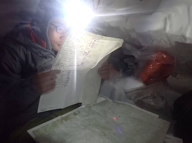 雪洞内にて。ソロになる水晶小屋以降の細かな地形を頭に入れた。地図の裏には日記と装備メモが書かれている。