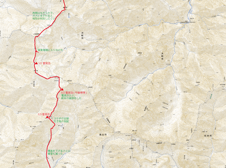 昨年の年越しと同じメンバーで集まり、「おもしろい登山は何か」という話し合いのもと、テントや避難小屋利用はなしの雪洞メインで進むことに決めた。ぎりぎりまで行程の話し合いは続いたが、3人で水晶岳を目指し、その後自分はソロで新穂高を目指した。