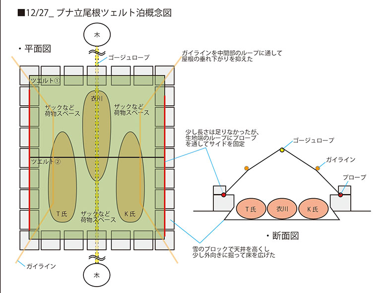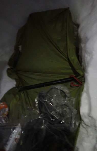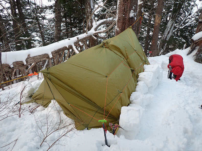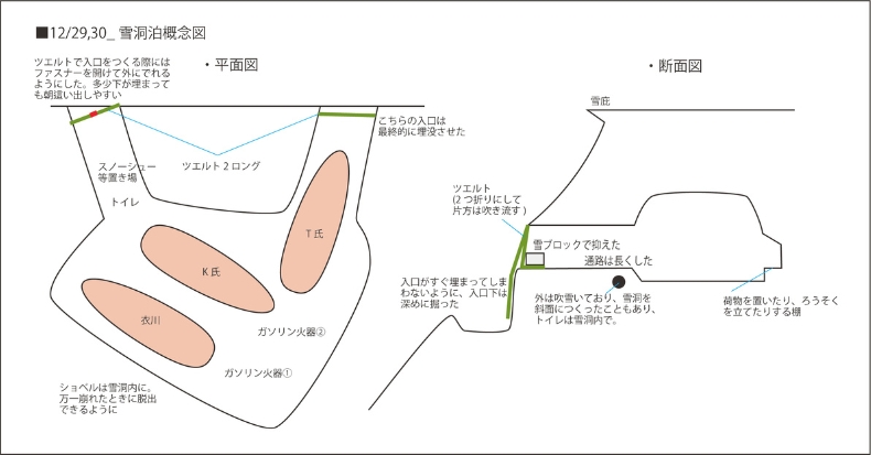 昨年の反省(低気圧接近により通常の季節風と逆風になり、吹き溜まりが削られ雪洞が崩壊した※)を踏まえ、入り口はかなり長くして、十分な天井の厚みをとった。ツエルトで入口を塞ぎ、固定に使ったピッケルなどにはガイラインを通して、雪洞内に引き込み、吹き飛ばされても喪失しないよう対策した。ただ、T氏のスノーソーがツエルト固定の際に、風に煽られ飛んで行ってしまった。