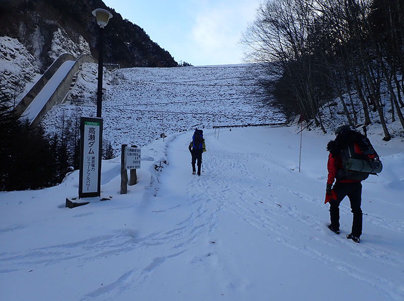 高瀬ダム前のつづら折り。雪は少ない。湯俣温泉の方に進む足跡がたくさんあった。
