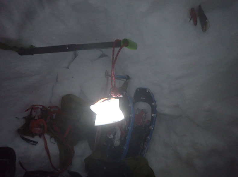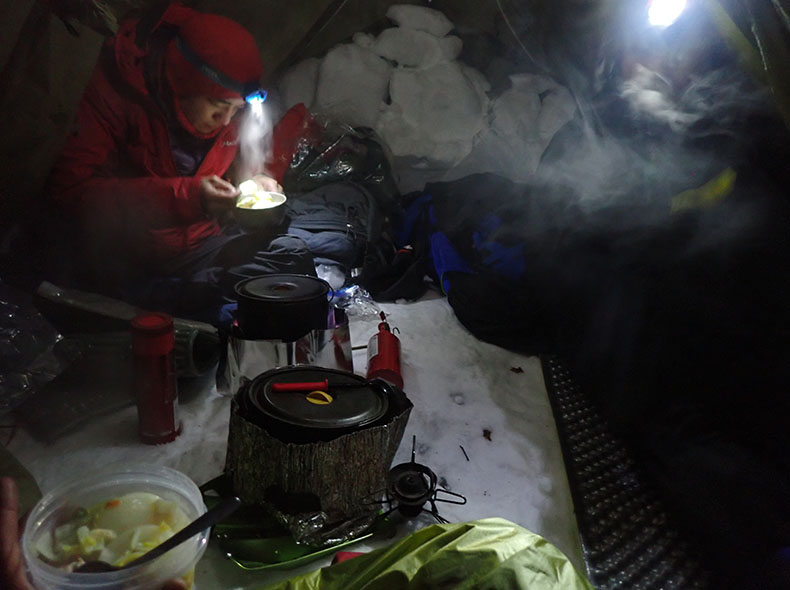 雪洞内にて。雪洞内では靴を脱ぎ、メリノスピンEXPの上からテントシューズを履いてすごした。