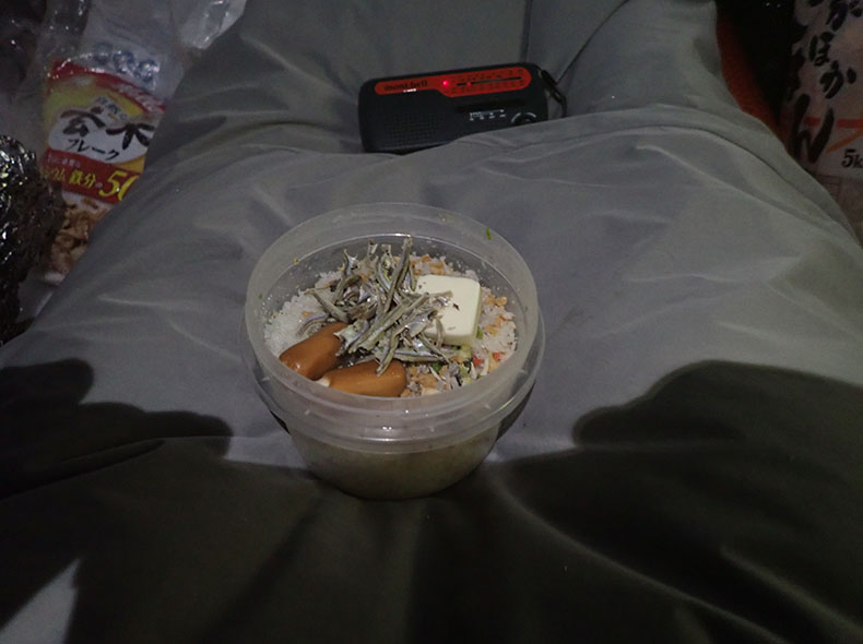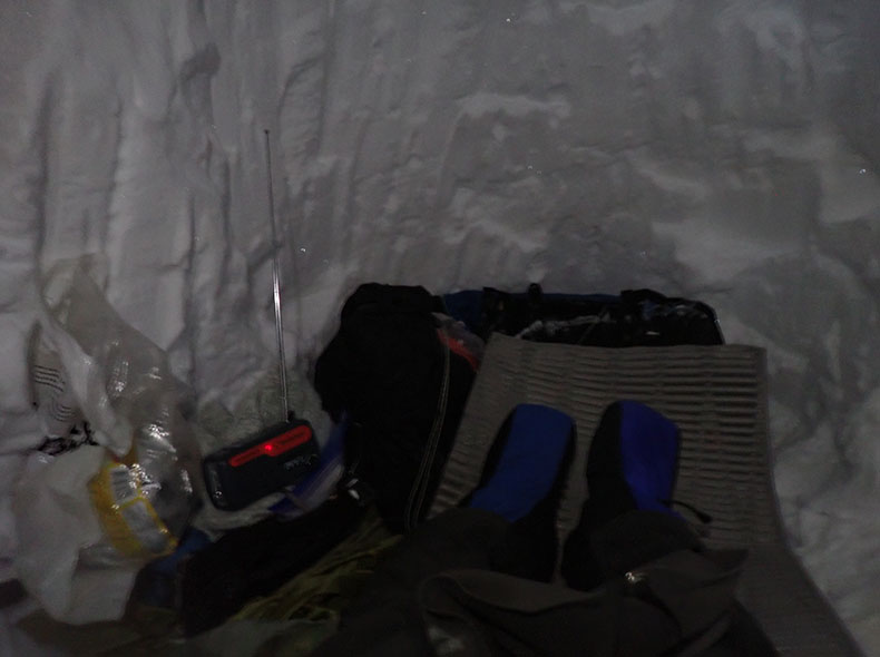 服をたくさん着て、お湯を作り、暖かいものを食べると少し落ち着いてきた。ラジオは電池だけでなく全体を温めると調子が良くなった。陽気なDJの声を聴くと、元気が出てきて、”大晦日あるある”といったしょうもない話でも一人雪洞内で爆笑していた。