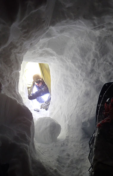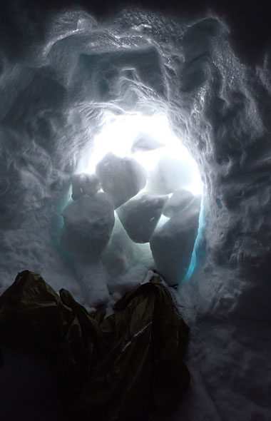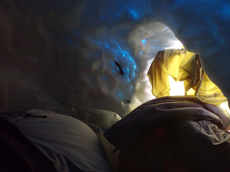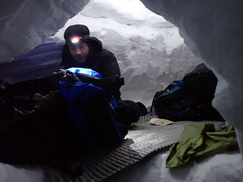 雪洞内にて。明るいが、午前中はたくさん雪が降り視界がなかったので半日停滞。