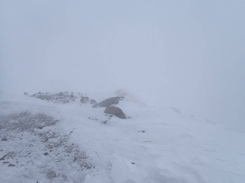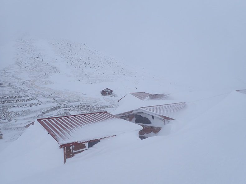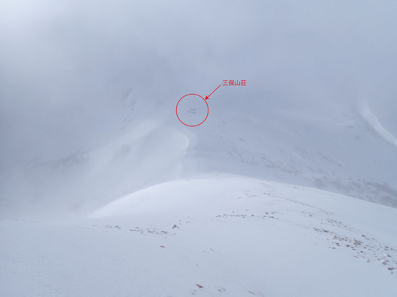 小屋の陰で休憩していると、風はわかる程度に激しくなっていった。少しワリモ方面に進んだが、完全にホワイトアウトしてしまい、目の前に段差があるのかもわからない。風は非常に激しく、昨日のT氏の言葉を借りるなら「人間が存在してよい空間」ではなくなりつつあった。