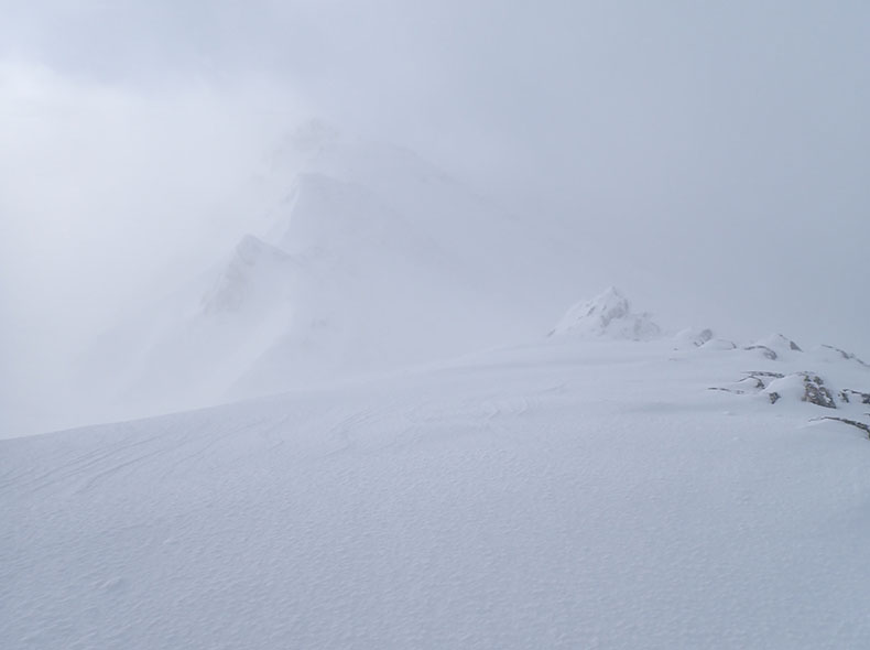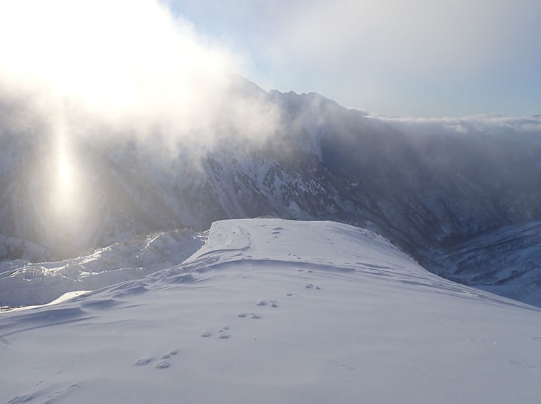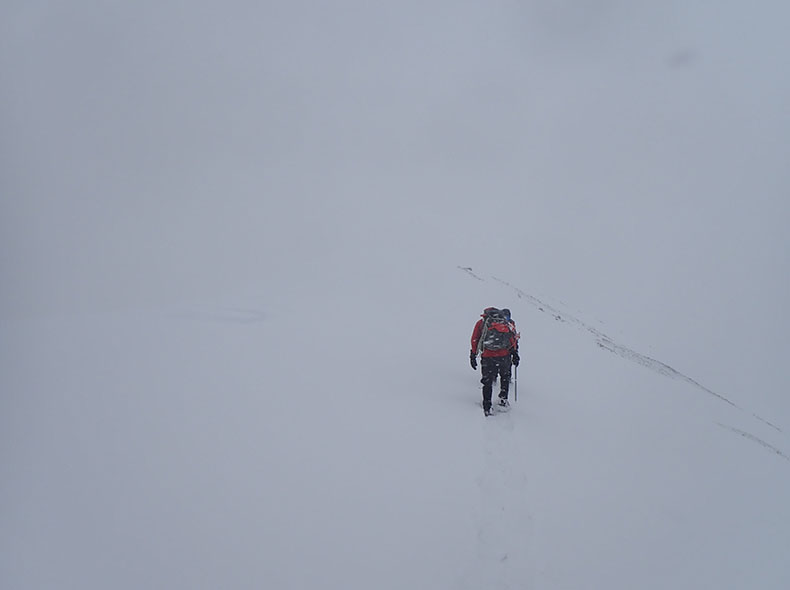 降雪により雪は深く、遅々として進まなかった。ただ、昨日の往復のおかげで、多少視界が悪くとも稜線の詳細を覚えていた。また、所々に残っている踏み跡の痕跡が、自分を元気付けてくれた。