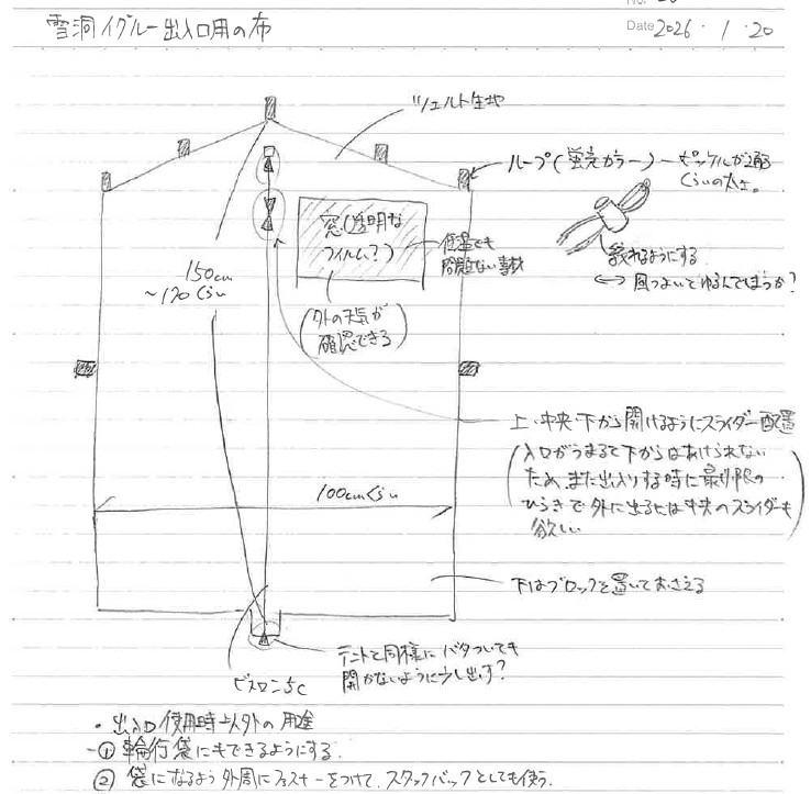 形になりそうなものはノートへ下山後清書する。写真はその”雪洞イグルー出入口用の布”の図。需要が狭すぎて商品にはならないが、次の山行までに個人的に作ってみようと思う。