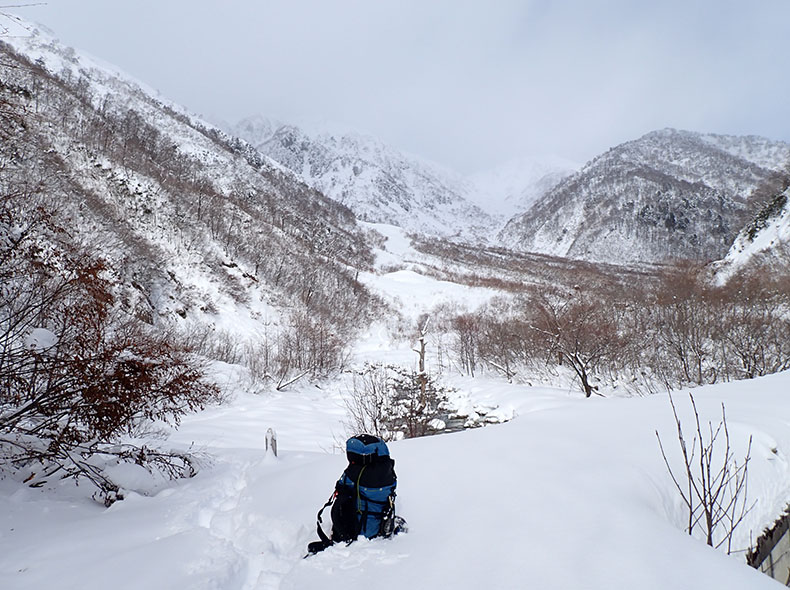 雪がもっとあれば、先頭空荷ラッセルで逆に楽なのだが、荷物をずっと背負っているので、永遠にしんどかった。