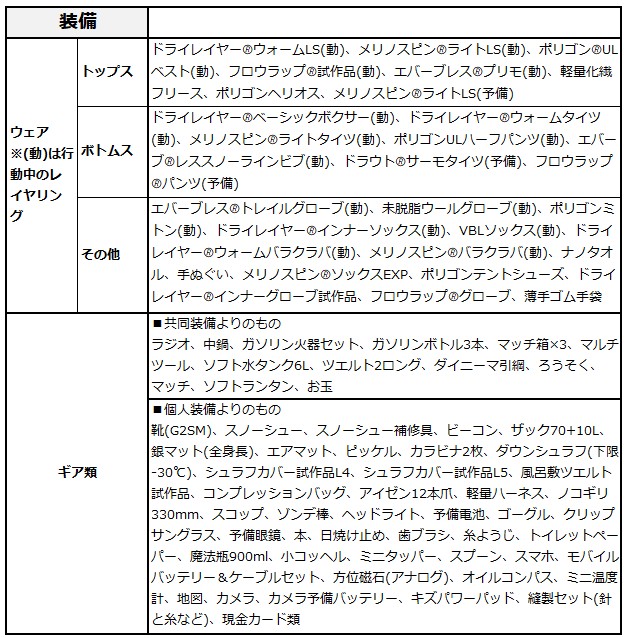 準備段階では、嵩張ることから持っていくかを迷ったが、雪洞内では一番活躍した。思った以上に暖かく、そして撥水する。同行者のT氏も同意見だったが、持って行ってよかった。フルジップタイプのパンツも欲しい。