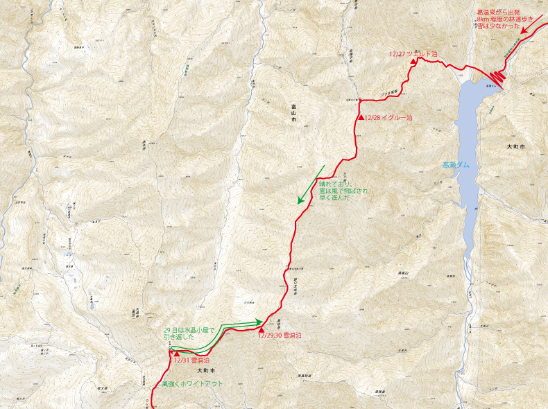 【12/27_DAY1:晴れ】行程:葛温泉→高瀬ダム→ブナ立尾根→1750m地点にてツエルト泊