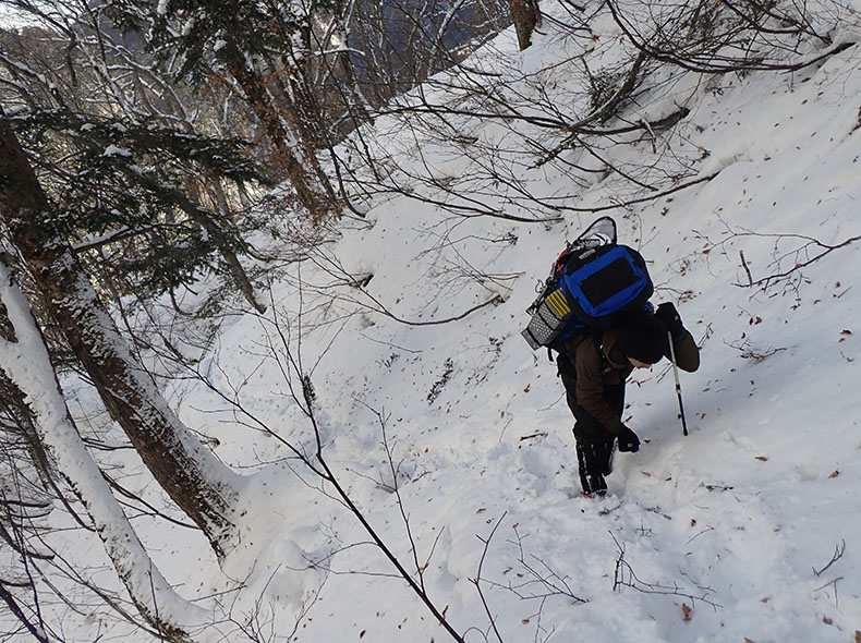 約8kmの林道を歩き、11時15分頃にブナ立尾根取り付きについた。雪は少なく、踏み跡もあり、ツボ足で進めた。1600mあたりのトラバースが悪く、アイゼンをつけた。荷物は重く、踏み抜くとバランスを崩して転びそうなるため、一歩一歩慎重に進んだ。