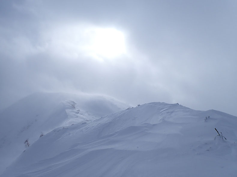 三ッ岳付近は風が強く、全体的に雪が飛ばされていた。歩きやすくはあるのだが。