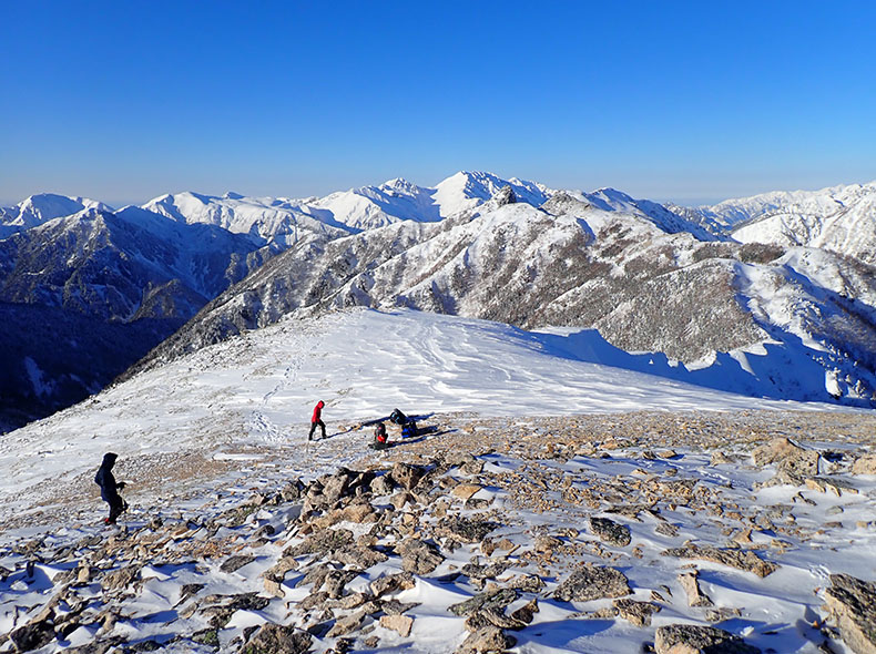 この日も快晴だった。風で雪が飛ばされているおかげで夏と同じくらいの速さで進んだ。年越しの北アルプスで3日も晴れが続くと、逆に不安になった。徐々に風が強くなったが、太陽が出ているおかげで、上はドライレイヤーウォーム+メリノスピンライト+フロウラップ+エバーブレスプリモの4枚のみで行動できた。