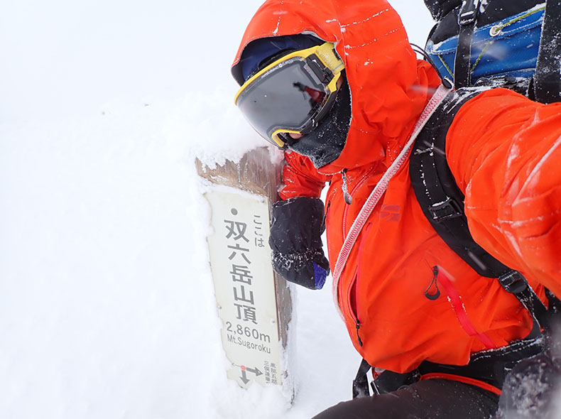 双六岳山頂にて。ソロだと同じ画角ばかりの写真になる。