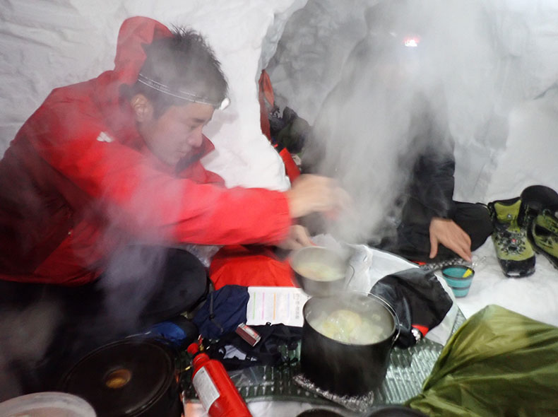 雪洞に入ったら、まずガソリン火器をつけて湯を沸かし、その間に服を着替えて、靴を脱ぎテントシューズを履く。そのくらいでお湯第一弾が沸くので、α化米を戻し、ボトルにも少し入れて飲みながら継続して沸かす。翌朝用の水を水タンクに詰め替え、湯たんぽとして使った。燃料に余裕があったので、暖かい湯たんぽで幸せだった(序盤は燃料節約でぬるい湯たんぽ)。