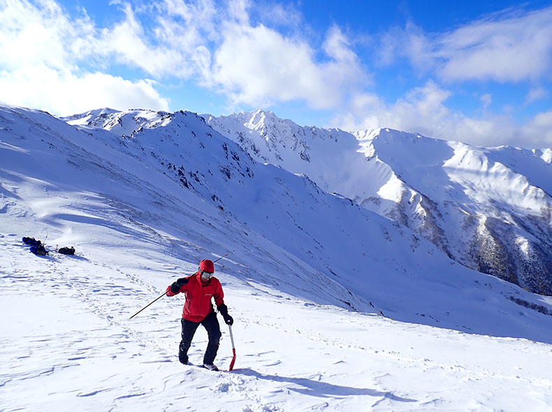 湯俣分岐のコルにて雪洞適地を探す。奥に見えるのが水晶岳。