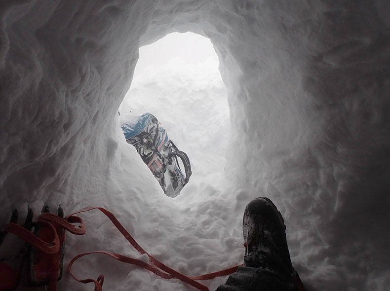 スノーショベルも吹き飛ばされそうな風で、持ち物を飛ばされないよう注意しながら、まず自分とザックがすっぽり入る程度の深い縦穴を掘った。そこから横方向に掘り進めた。