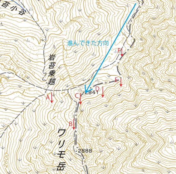 歩いた距離感覚と方角的にはC付近のはずだが、積雪により地形図通りの地形ではなかったことと、10m程度の視界の中進んでいたため、下り始めた時に自信が持てなかった。