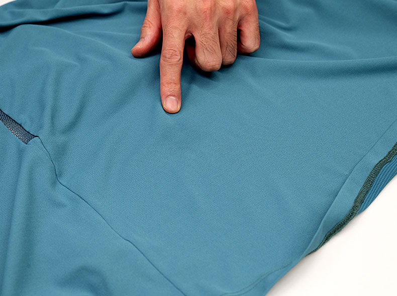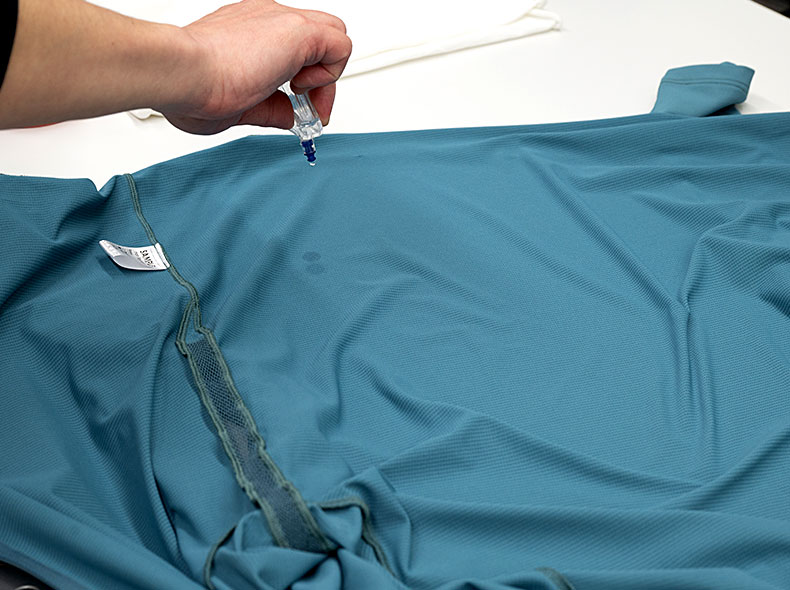 生地の肌側に水を滴下して数秒後。指さしているのが滴下した場所だが、目を凝らさないと濡れた色が分からないくらいに染みが目立たない