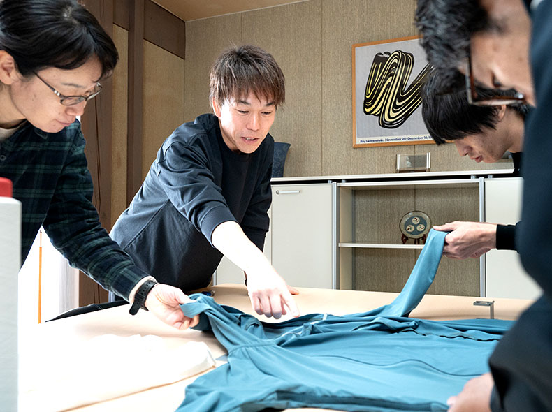 またミツカワ(株)の職人たちは、生地の経過や出来栄えを確認する際は、データや数値を想定し、まずは手触りや視覚的な感覚を重視しているといいます。編み機を使いこなす卓越した「手」の技術に、顧客のニーズを汲み取り最適な提案へとつなげる「頭」、そして品質を鋭く見極める「目」。これらの強みが三位一体で合わさり、ものづくりに生かされていることこそ、ミツカワの真骨頂だと言えるでしょう。