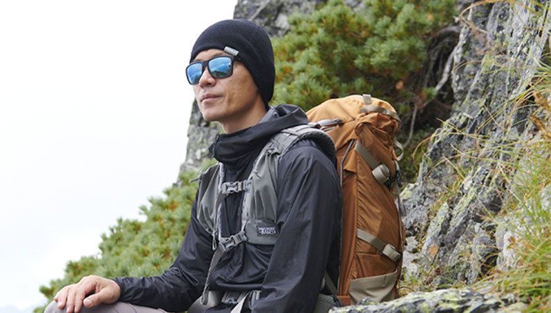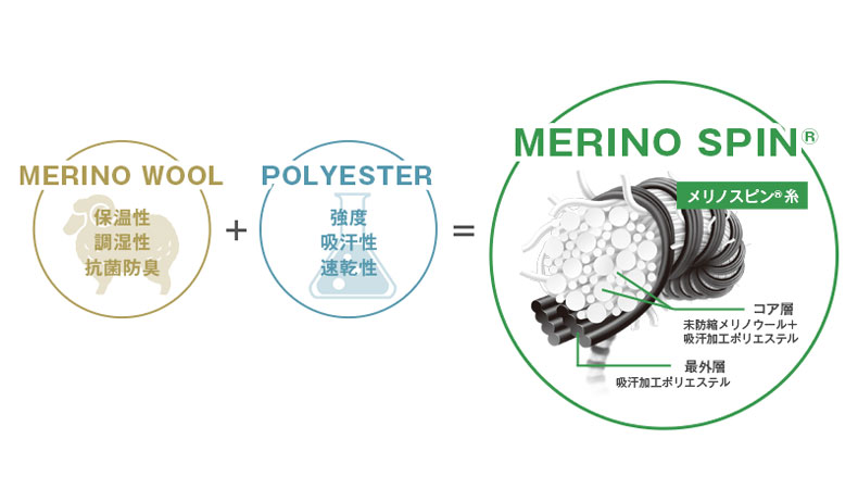 肌側生地に使用した「メリノスピン®」糸とは、未防縮メリノウールと機能性ポリエステル繊維を混紡し、それを異型断面ポリエステル繊維でスパイラル状にカバーリングするfinetrack独自開発の糸。機能性ポリエステルの優れた「吸汗拡散性」「繊維強度」と、ウールの優れた「保温性」「調湿機能」「消臭機能」を引き出します。