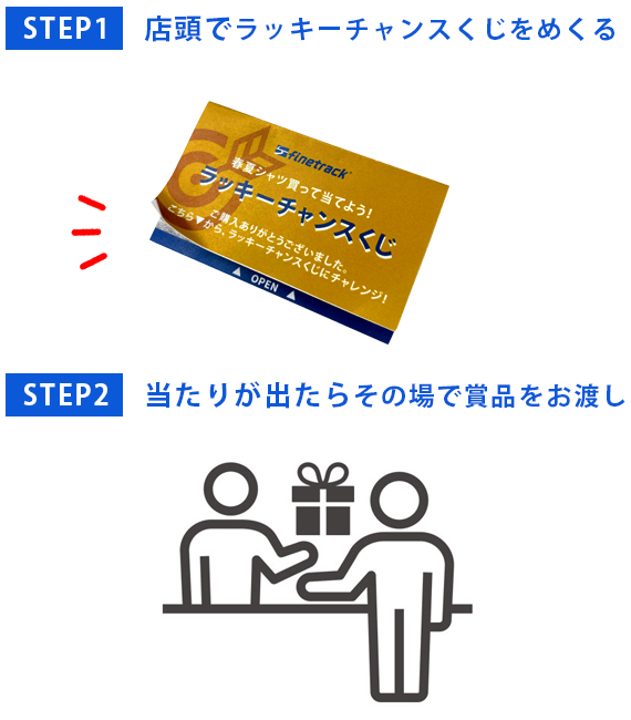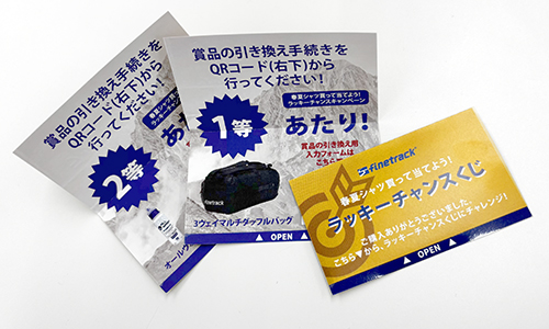 キャンペーン期間中、finetrack BRAND STORE(公式WEB STORE・直営店TOKYO BASE)で、春夏シャツ(L2:ベースレイヤー/L3:ミッドレイヤー)をはじめとする対象商品をご購入いただいたお客様に、“ラッキーチャンスくじ”をプレゼント。あたりが出た方、合計25名様に春夏のフィールドで活躍するアイテムをプレゼントいたします!